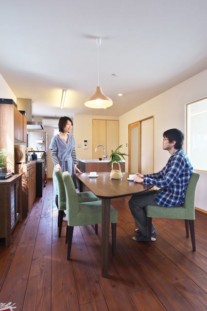 自分の感性に合わせてスタイルメイクができる、シンプルでナチュラルな空間を提案するヤヨイ建設。壁や天井に採用した珪藻土や無垢材のフローリング。天井、壁、床、すべての断熱材にパルプを原料としたセルロースファイバーを採用するなど、住む人の健康と環境を考えたプランで、シンプルという言葉がピッタリの空間を造り出し、シンプルゆえにできるスタイリッシュな暮らしを提案している。取材させていただいたお宅は、深みのある色の家具や床を採用したシンプル&シックの空間。ナチュラルの取り入れ方、使い方しだいでどんな暮らしにも対応できるという、家づくりの特長がよく現れた例といえるだろう。姫路・御立台のモデルハウス『丘のいえ』で、まずはご体感を。