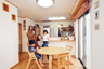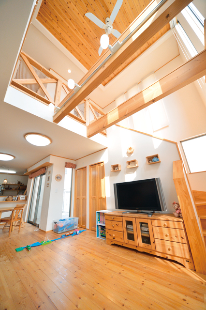 大きな吹抜けから降り注ぐ暖かな陽射しに包まれたリビングは、Tさんの家の一番のこだわり。ご主人が「家族が集まるリビングは気持ちよく過ごしたい!」というご要望から、吹抜けの解放感や無垢材などの自然素材をたっぷりと使用し、家族が自然と集まりくつろげる空間に。「陽当たりが良くて冬も暖かい。無垢材の床は本当に素足が気持ちいいんです」というお言葉に満足感が現れていた。「かわいいお家にしたい!」という奥様は、雑誌などの切り抜きを集め、細部までじっくりと打合せをした。そんなこだわりがつまった家には、毎日の暮らしの楽しさを伺わせ、家への愛着も感じられる。無垢材や玄関土間の御影石など本物の素材を随所に使用したのは、施主の健康や何年たっても住み続けられるよう耐久性やメンテナンス性を踏まえたハウジング山一からのアドバイス。描いていた夢を叶えてくれるパートナーにも恵まれた。