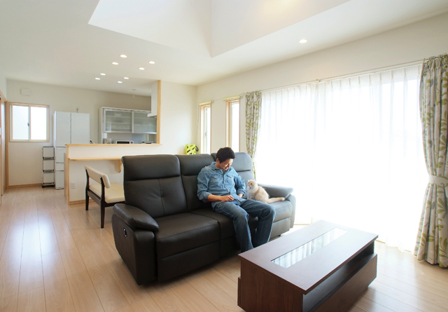 吹抜けのある明るいリビングは、ご夫婦とペットの寛ぎの空間。互いが暮らしやすい、様々な仕様も採用