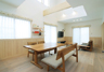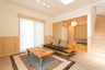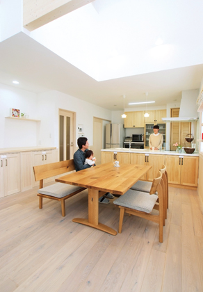 施工店探しを進める中で出会った秋山住研の加佐モデルハウス。Fさんは、自然素材の室内を見て「一目で魅かれた」という。ここで提案されていたスタイルは、ご夫婦が理想とされていた「自然素材に囲まれた住まいで健康に暮らす」という思いにも、描かれていた住まいのイメージにもぴったりとフィット。キッチンからリビングまで一体となったLDKには、そのセンターに吹抜けがあり、横にも縦にも伸びやかさを満喫できる空間が広がる。ハイサイドライトを含め各所に設けられた窓からはたっぷりの光が差し込み、どのスペースをとっても明るさにあふれた印象だ。室内仕上げは念願どおり。壁や天井を漆喰塗りとし、床は無垢のオーク材。腰板や造作、建具まで、すべてに無垢材を採用されている。「木に囲まれた雰囲気が好き。室内が広くて圧迫感もなく明るい。家賃を払い続けるより、明らかに有意義」と語られていた。