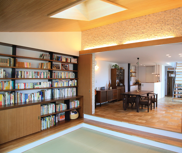 家族が寛げるようタタミ敷きとされたリビングには暖炉。心癒す炎のゆらめきと温もりに誘われるように、一人また一人と家族が集まってくるこの空間は、Yさんの理想のライフシーンを叶えるもの。家族の気持ちまでつなげるような、安らいだ雰囲気に包まれていた。アンティーク調に造作されたリビング扉を開けると、ダイニングキッチンからリビングへとつながる大きな空間が広がる。2階へとつづく階段は吹抜けになっており、2面の掃き出し窓だけでなく、上部からもたっぷりの陽射しを浴びて、室内は明るい印象。壁は白、家具は深い色合いで統一されていたが、このコントラストも明るさの中に温もりを醸し出していた。打ち合わせでは、日頃の暮らし方に至るまで細かなヒアリングを受けたというYさん。担当設計士とじっくりと取り組んで完成をみたマイホームに満足されていた。