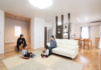 「企画住宅ではなく、自分らしい家」を模索されていたHさん。イメージしていたのは、奇抜なものでもクールなものでもなく、自分にとっての寛ぎがあるモダンスタイルの住まいだ。LDKは、飾り棚も付いたデザイン柱で仕切っただけのワンフロア。水廻りはキッチン奥に配置され、家事動線もいたってコンパクトにまとめられていた。以前のお住まいが「とにかく寒かった」ことから、新居には〝暖かさ〟も求めたといい、ウレタン吹付断熱を採用して高い断熱性を確保。24時間計画換気システムと、冬暖く夏涼しい床下地中熱を利用し室内に空気循環させる床下設置型第1種セントラル換気システムも搭載して、温度差もなくどこにいても快適な室内環境を手にされていた。