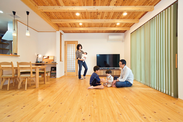 無垢材や漆喰が織りなす自然空間に家族の笑顔がはじける、寛ぎの住まい
