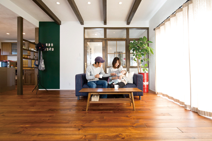 年代物の愛車ワーゲンビートルがファサードを飾るFさん邸は、ヴィンテージライクのアメリカンスタイル。2年という長いプラン期間の中でお気に入りのカタチを見つけ、一つ一つ積み上げて完成したのがこの住まいだ。ボルドーパインのフローリングには自然塗料で塗装した後にふき取りを行い、その上にクリア塗装を施すなど手間を掛けた床は、室内全体にヴィンテージ感をもたらしていた。壁と天井には漆喰が採用されており、室内空間の印象は、至って穏やかで寛いだもの。インテリアや雑貨も好きなテイストで統一され、程よい演出アイテムに。壁の漆喰塗り体験もし、ドアの取っ手や照明器具も自ら購入するなど、Fさんは家造りの全過程を楽しまれたという。