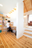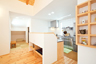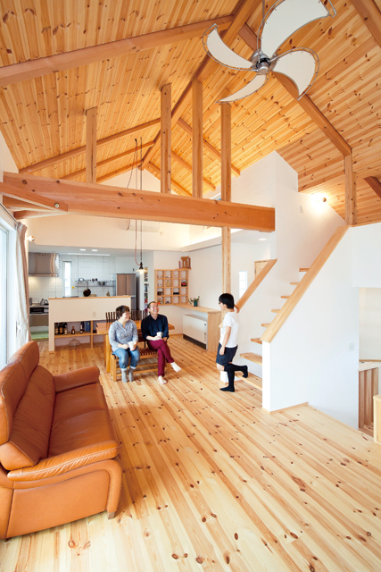 山登りやアウトドアライフがご趣味というKさんが選んだのは無添加住宅。漆喰や天然木に加え、接着剤に至るまで化学物質を使わない天然素材の住まいだ。くつろぎスペースのLDKは2階に設け、山小屋風の高い梁天井や、周囲の山々が最も美しく眺められる位置に窓が配されている。システムとは別にアイランド型の調理台がある広いキッチンスペースには収納やパントリー、家事室などが設けられ、抜群の家事動線。リビングから子どもたちが自由に行き来できる気軽さは奥様の望んだライフスタイルだ。天然素材ならではの存在感と思いやりにあふれた空間設計や造作を感じるKさん邸。その暮らしへの愛情は「もう贅沢すぎるくらい申し分ない」と笑う、奥様の幸せな笑顔が物語っていた。