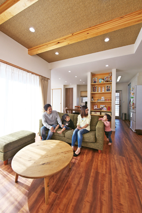 ご主人は花粉症、上のお子様は敏感肌のアレルギー体質の傾向があり、健康に配慮した住まいづくりを第一に考えていたTさん。そろそろマイホームをと考えていた2年前、OB施主であった会社の先輩から美松ホームを紹介され『炭の家』のオープンハウスを訪れたそうだ。「展示場に入ったとたん、空気の違いがわかった」と、迷うことなく施工会社に選ばれた。空気清浄作用や、調湿、防腐、消臭効果があるといわれる炭だが、この『炭の家』では、1階の天井と床下に合計1000㎏もの炭を配置した24時間換気システムが採用されている。建築の構造上必ず生まれる空間を活用するので、外観フォルムや建築スタイルへの制限はなく、自然素材で仕上げる家などに比べて、“低コストで空気のキレイな住まい”を実現できるのが魅力だ。きれいな室内環境の中で育まれていく健やかな暮らしを手に入れたTさんご家族。幸せな家族の笑顔がそこにあった。