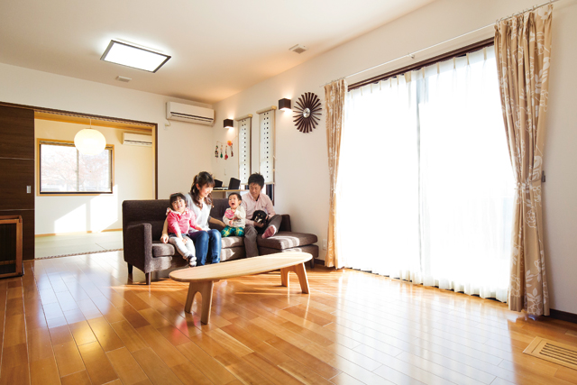 Mさん邸は、〝地熱〟活用の換気システム『GEOパワーシステム』で、快適な住まいを実現されたお宅だ。このシステムは、地中に埋設したパイプの中を空気循環させることで、夏の暖かい外気を冷やして室内へ、冬の冷たい外気を暖めて室内へ送り出し、〝涼しい夏、暖かい冬〟を実現。さらには、ヒートポンプによって室温を安定させることができ、「夏場はほとんどエアコン要らず。冬場も深夜運転だけで済む」というから、光熱費の削減効果も大きい。Mさんが『GEOパワーシステム』を採用されたのは、初めて丸尾建築のモデルハウスを訪れた際、「自然の冷気が心地よく、エアコンがなくても涼しい。この住まいなら、苦手な冷房をあまり使わなくても暮らせて、子供のためにもいいはず」と感じられたことから。外から帰ってきた時のサラッとした室内の空気感や、エアコンに頼らない健康的な暮らしなど、「思い描いたとおり」の住まいには大満足のご様子だった。