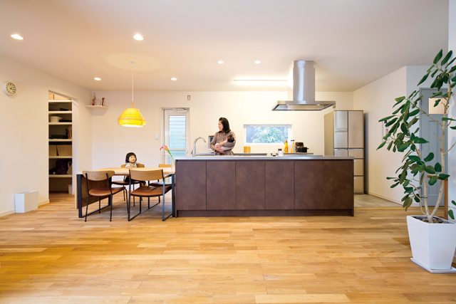 奥様にとって、キッチンは一日の中でも長い時間を過ごす場所。だからこそ、お気に入りのデザインで、キッチンを中心としたプランを描きたい。F邸のキッチンは神戸スタイルキッチン製のオーダーメイド。住設メーカーの既製品では何かを我慢しなければならず、内観とのコーディネートからも必然の選択だったようだ。「茶系だけど木目じゃなく、マット感を出したかった」というキッチンは、レザーフェイスの扉や艶消しのステンレストップで構成され、いかにもシック。自然素材仕上げのシンプルな室内を彩るインテリアのような存在であり、暮らしを象徴するかのような洗練された空間だ。不要なものは一切置かず、おしゃれにコーディネートされたインテリアのようなキッチンが、暮らしのクオリティを高めているのは明らかだろう。