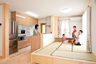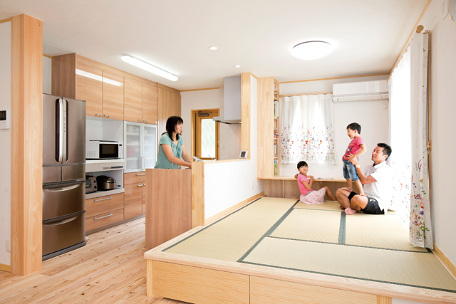 自然の風や光、自然素材に囲まれた暮らし。それは、子供たちの健やかな成長のためにも、Sさんがどうしても叶えたかった家づくりのテーマだった。内装は、1階、2階、水周りを問わず、すべて漆喰と浮づくりの飫肥杉。室内には、理想とされた自然素材の空間が広がっていた。また、工務店選びのキーポイントにも挙げられていたとおり、断熱にはパルプを原料とした自然系素材のセルロースファイバーを採用。高い断熱性とともに防音性や調湿性にも優れた断熱仕様によって、居住空間の快適性も手にされている。リビングに寝そべって笑顔を見せる子供たちを、キッチンやダイニングからご夫妻で見守るのも日常のひとコマ。室内に居る時は子供たちはいつも裸足で過ごし、無垢の木の香りや畳の香りも身近に。Sさんが望んだ穏やかな暮らしが、そこにはあった。